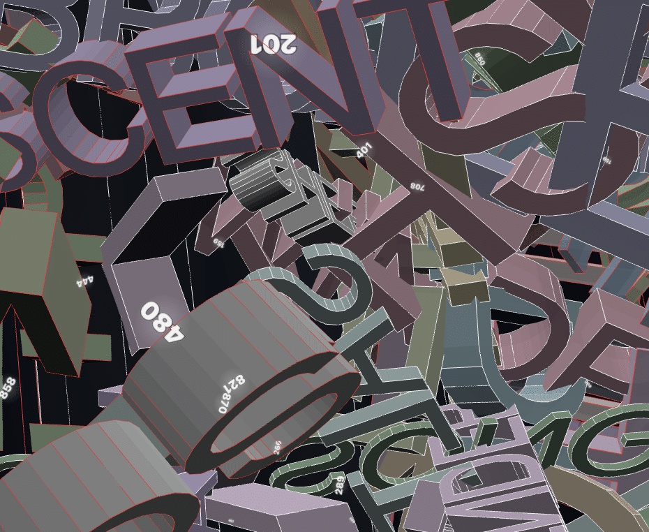 This work attempts to replicate how AI might see and understand language. Not as an ordered grammar or a flowing story, but as cluttered and crushed words, toppling from walls. Those words are then picked and tossed into our field of view. Language isn’t a beautiful vehicle for joy or story, it’s a pile of numbered options intersecting and colliding.
